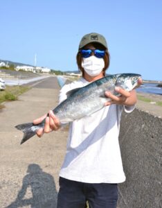 30メートルほど投げてただ巻きすると、わずか2投目で寝ぼけ眼だった男性の目を覚ます強い当たりがきた。上がったのは49センチのカラフトマスだった。以降、暗いうちはヒットがなかったが、5時から当たりが頻発。だが波打ち際でのばらしが多く、2匹目は追加できず。ただ左隣の人が金系小型スプーンで2匹釣っていたという。