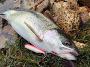 解禁初日となった12月1日、ウインターシーズンに実績の高い湖東岸を訪れた。午前9時ごろ、力岩観察広場(旧滝之上キャンプ場)付近に到着。雨風が強い厳しいコンディションだったが、湖岸で4、5人がトラウトを狙っていた。ワンド状の湖岸でルアーを投げていた苫小牧市のベテラン男性は、5時から釣り続けたがノーヒット。ルアーボックスを見せてもらうと、使い込んだオールドスプーンでいっぱいだ。「定番のコパー、ゴールドのほかに冬は赤やオレンジのスプーンに実績があるよ」という。